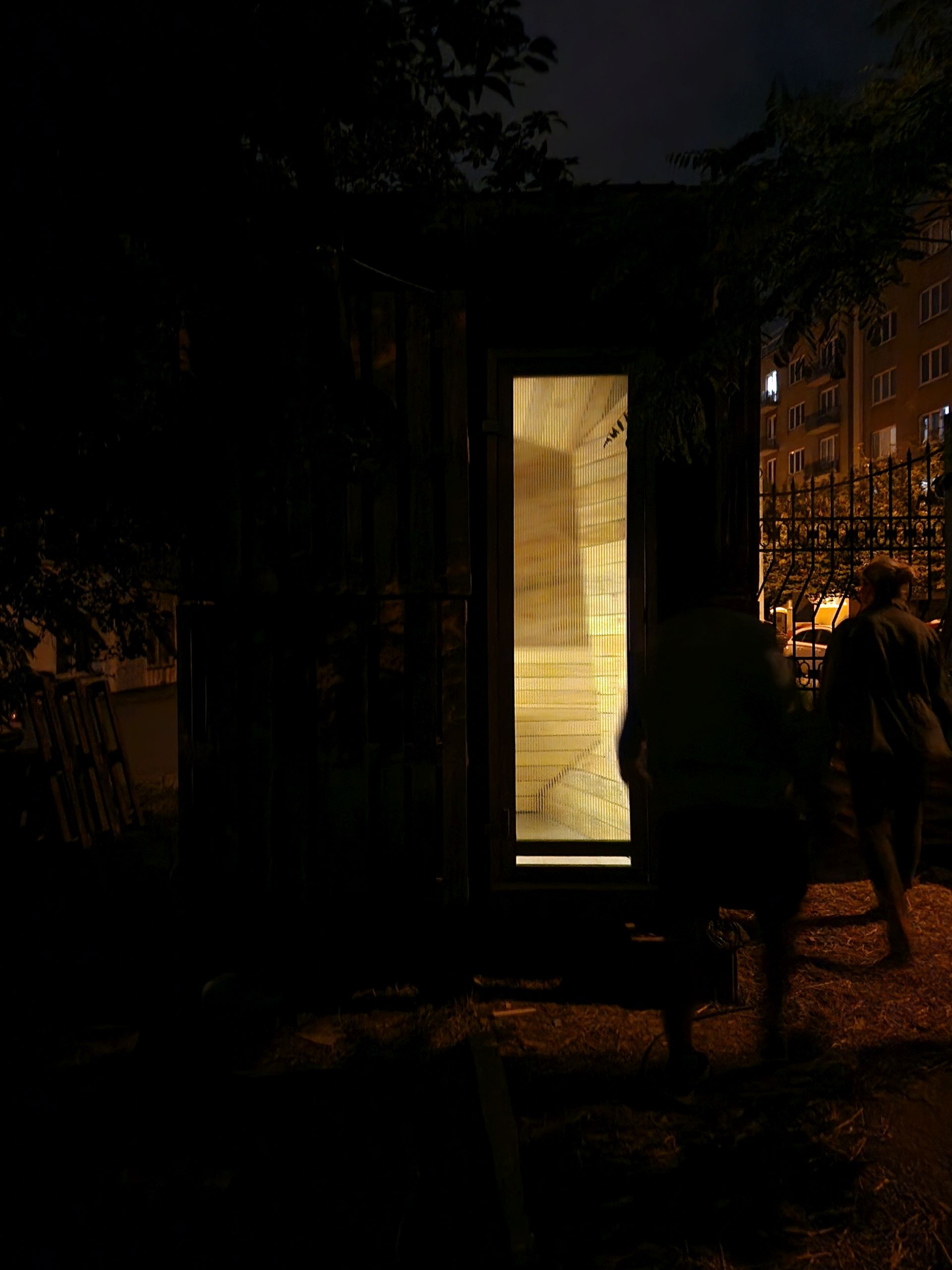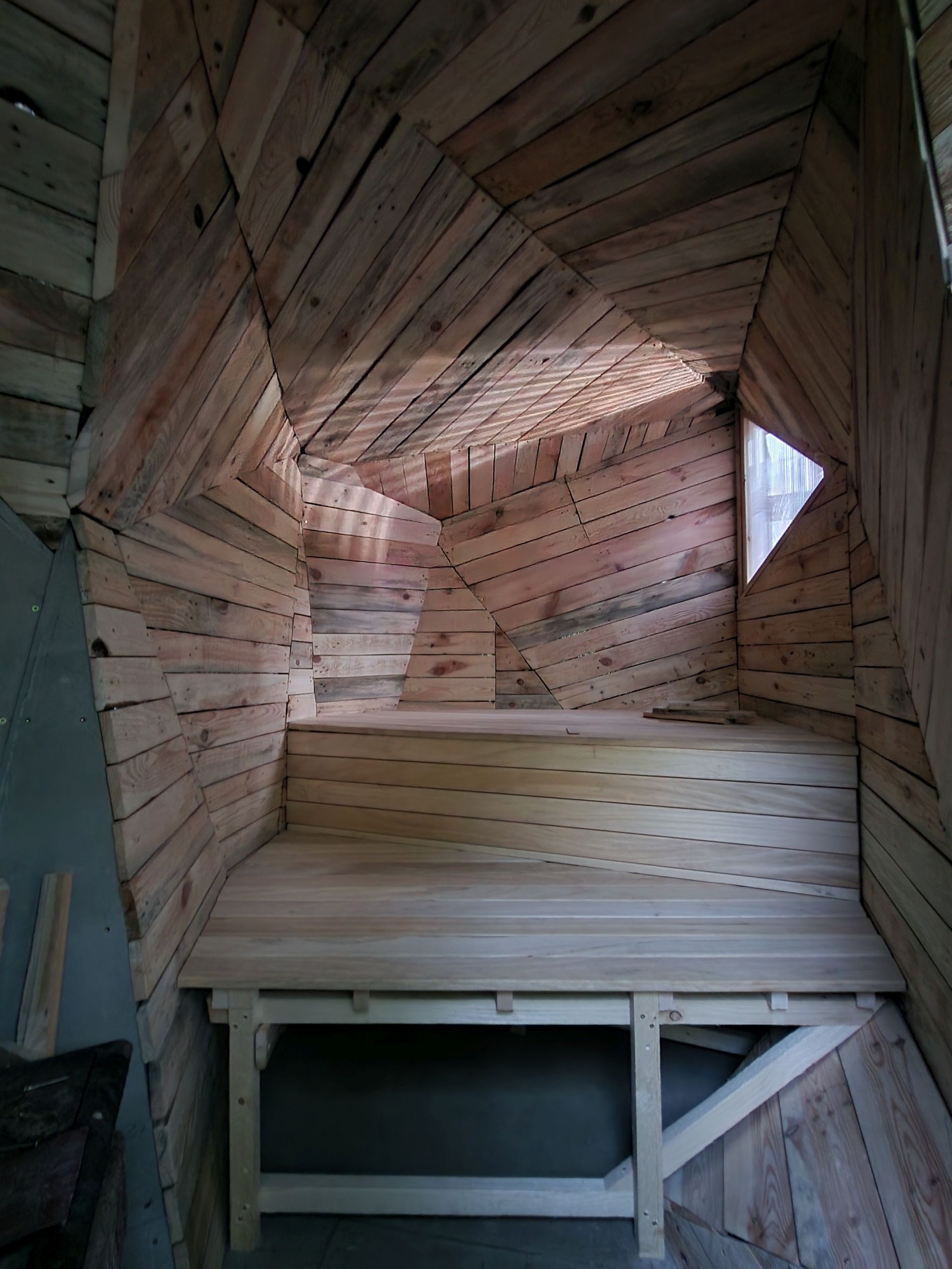 „Návrh sauny využívá moment překvapení pro návštěvníka. Z venku se tváří jako nenápadný kvádr, ale při otevření dveří se ocitnete ve zcela jiném prostoru. Vnitřní struktura připomíná jeskyni ve skále, kde se člověk cítí bezpečně a klidně. Prostor, který vybízí k relaxaci a nabídne nevšední požitek ze saunování.“